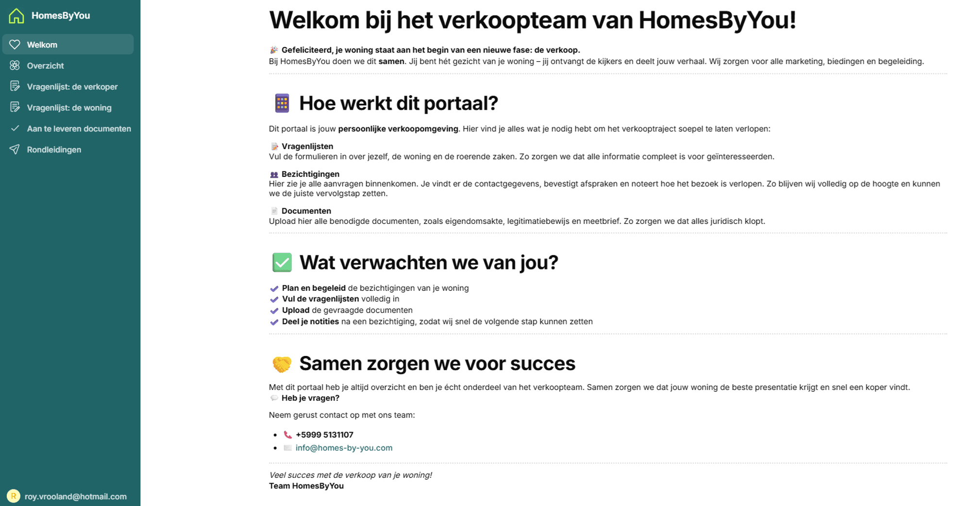 Bij HomesByYou geloven we in een moderne, digitale benadering voor het verkopen van een woning. Daarom hebben we het HomesByYou Portaal ontwikkeld: een online omgeving waar jij als verkoper een actieve rol hebt in het verkooptraject. In dit portaal bouw je stap voor stap een digitaal dossier op en volg je eenvoudig alle stappen van het verkoopproces. Zo weten we precies wat er nog moet gebeuren en werken we samen naar een succesvolle verkoop.