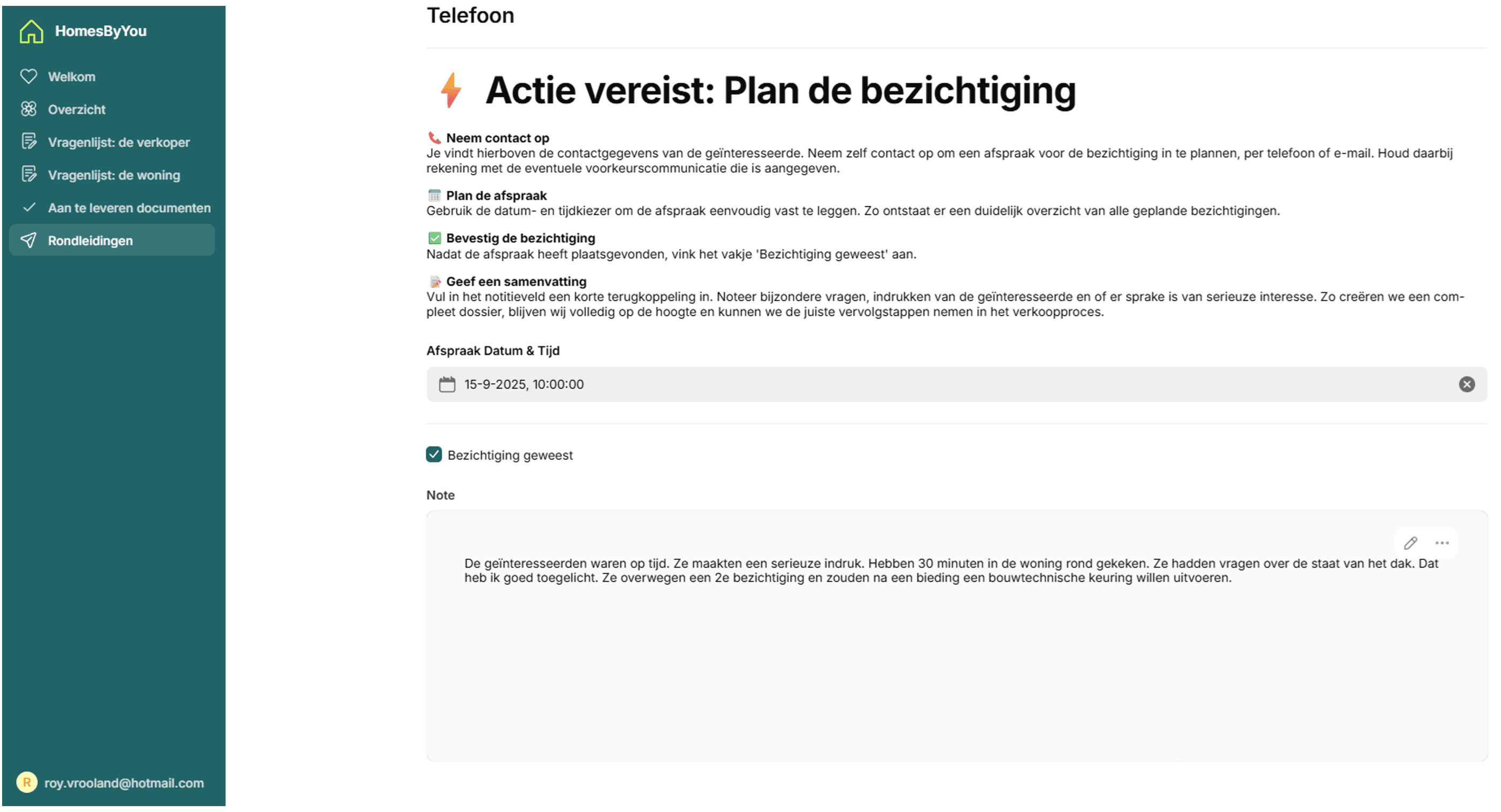 Een belangrijk onderdeel van de verkoop zijn de bezichtigingen. Alle aanvragen komen binnen in het portaal. De verkoper neemt vervolgens contact op met de geïnteresseerde om een afspraak te maken en bevestigd de datum en tijd het portaal. Na afloop van een bezichtiging vragen we je om een korte beschrijving of terugkoppeling te geven. Hoe is het contact verlopen? Wat was de indruk van de kijker? Zijn er vervolgacties nodig?